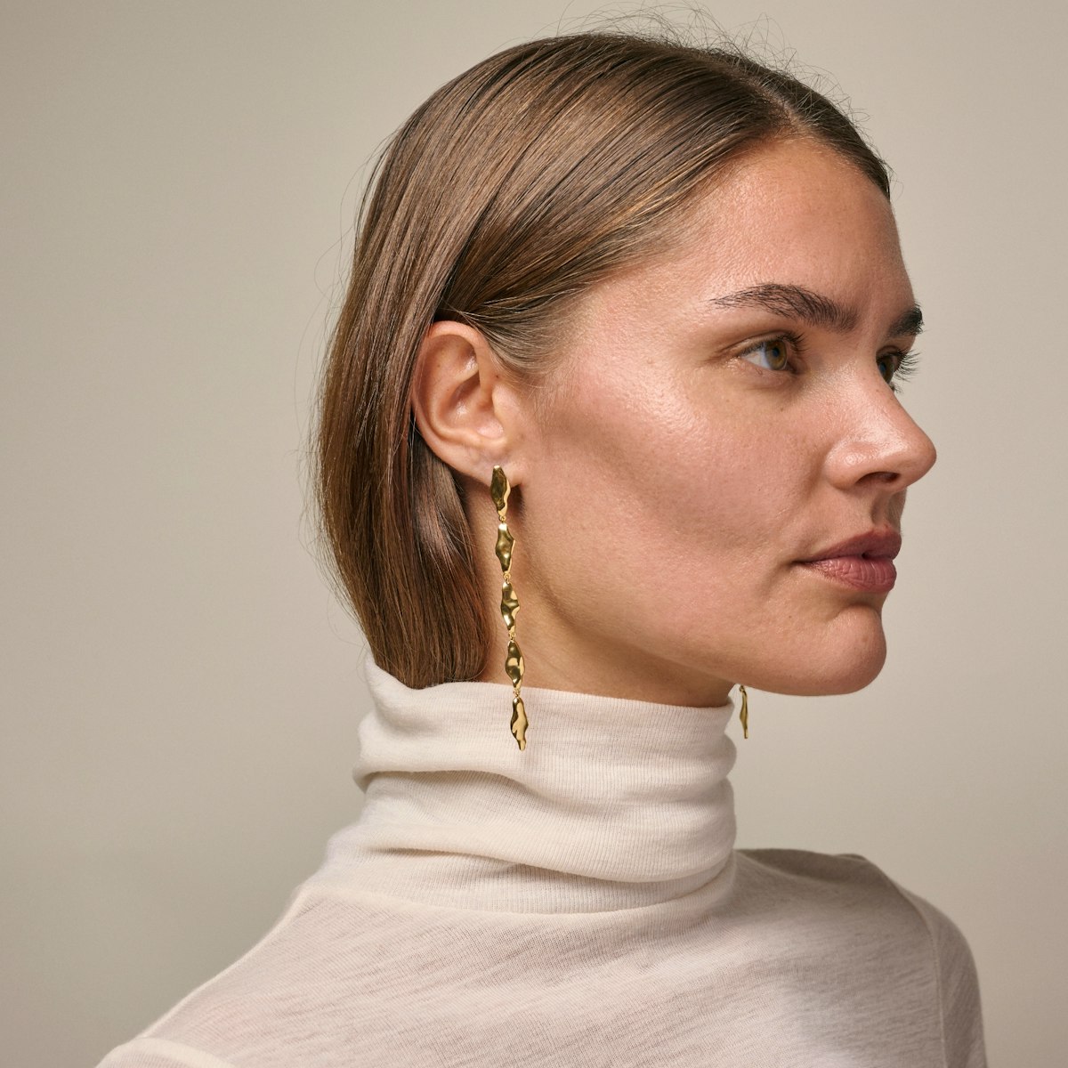India øreringene i forgyldt 18 karat guld er et smykke, der udstråler eksklusivitet og elegance. Disse elegante øreringe består af fem aflange led, der hænger under hinanden og skaber en dynamisk og slank silhuet. De håndlavede led giver øreringene et unikt og iøjnefaldende udtryk, der fanger blikket og tilføjer et luksuriøst touch til ethvert outfit. Med deres moderne og stilrene design er India øreringene det perfekte valg, når du vil sætte prikken over i’et på dit festlook.
