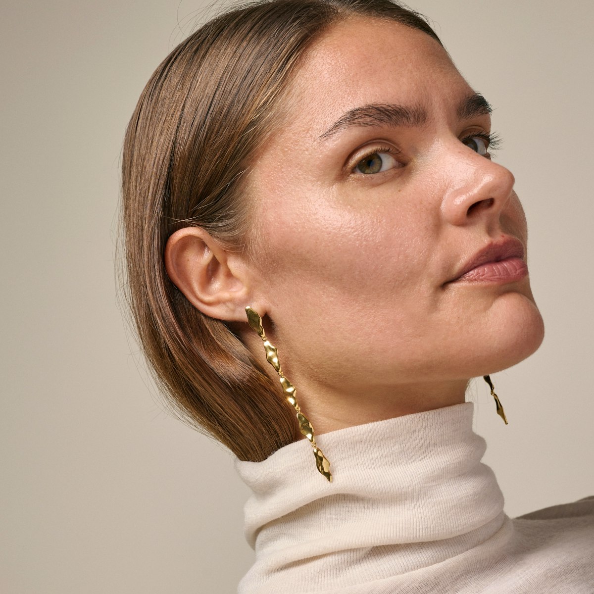 Øreringene er fremstillet af 925 sterling sølv og belagt med 18 karat guld, hvilket sikrer både kvalitet og langvarig skønhed. Denne kombination af ædle materialer og det håndlavede design gør India øreringene til en uundværlig del af enhver smykkesamling. Øreringenes dynamiske bevægelse og gyldne glans skaber en sofistikeret balance mellem elegance og moderne design, hvilket gør dem til det ideelle valg til både festlige lejligheder og særlige begivenheder. Hvis du søger et smykke, der både er stilfuldt og eksklusivt, er India øreringene det perfekte match.