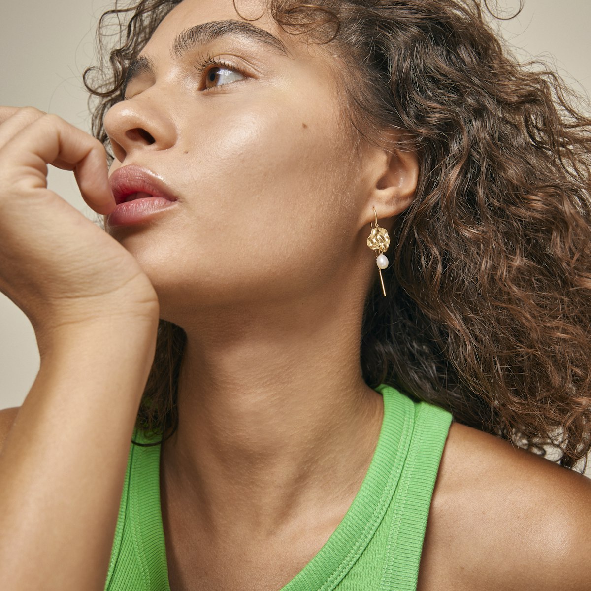 Fortil ser man den smukke sammensætning af det rå guld og den nydelige perle, og bagtil ser man den lette, livlige kæde. Kai øreringene er gode at kombinere med andre søde øreringe, men er også et smukt par i sig selv.