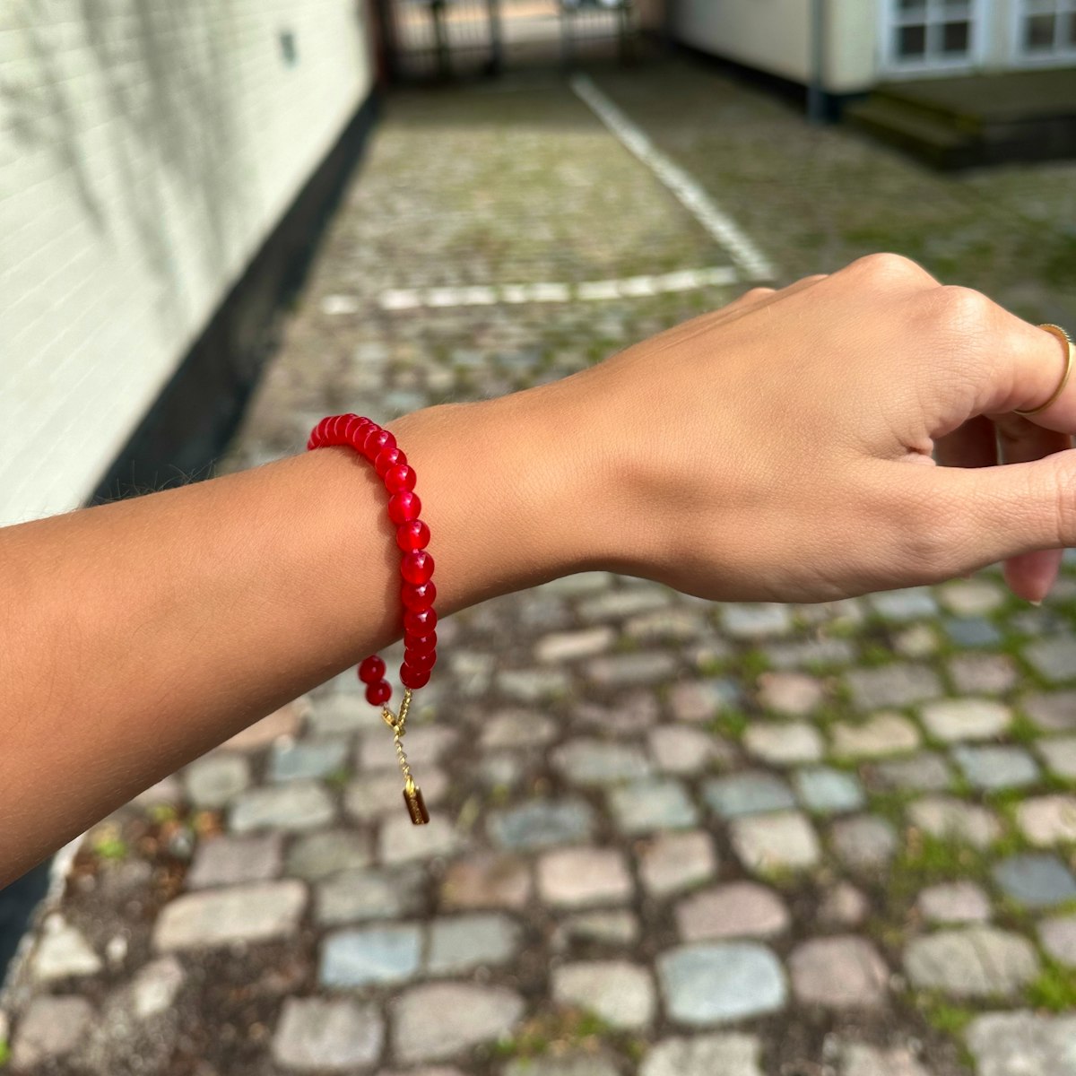 Designet på dette armbånd er inspireret af farverigt havglas, man finder på stranden, og det kan både mærkes og ses. Hver perle har en blød, mat overflade og en let glans, der fanger lyset smukt, uden at være for meget. Armbåndet emmer af leg, lys og liv – og den røde farve? Den gør lige præcis dét, som gode accessories skal: Får dig til at føle dig stærkere, gladere og lidt mere modig.