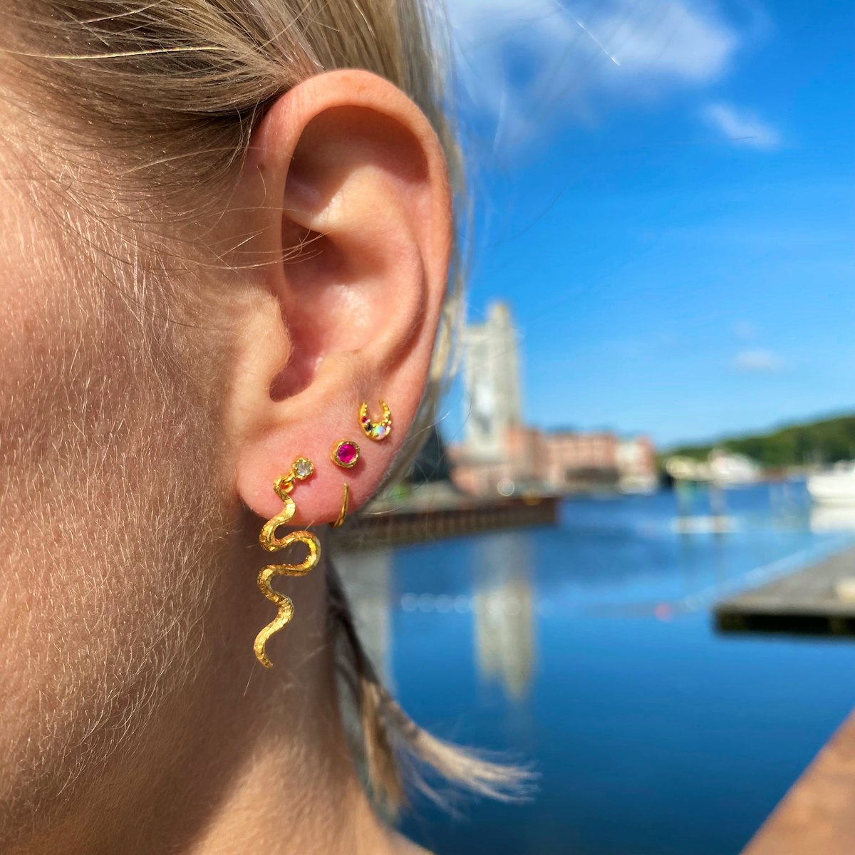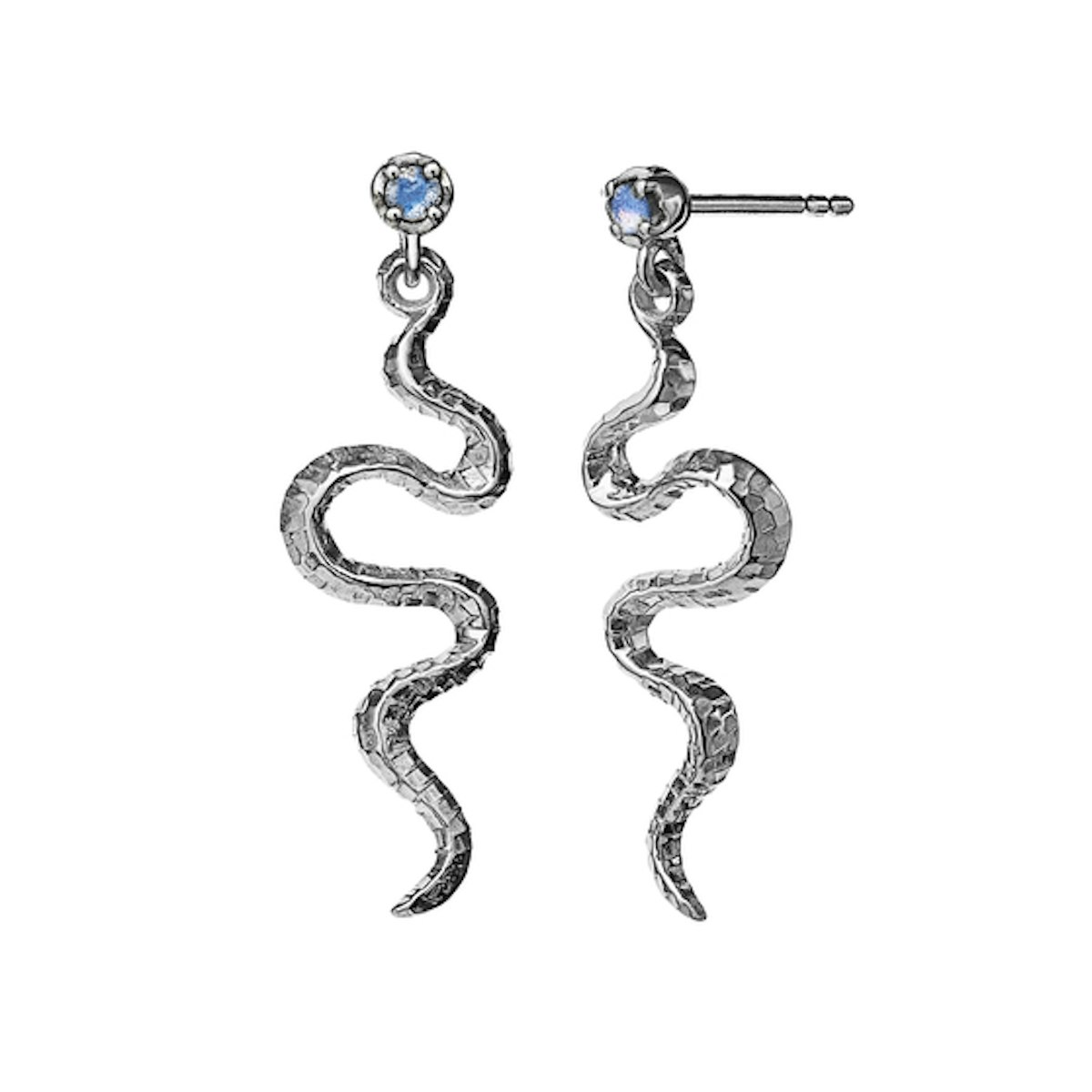 Utrolig flotte slangeformede øreringe med en smuk facetteret labradorit og unik hammerslået overfalde.