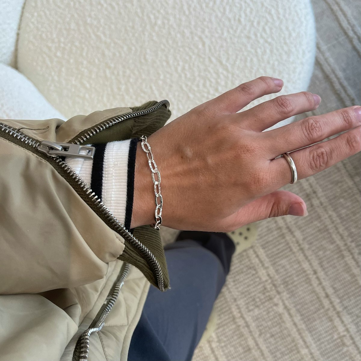 Vinteren kan være både smuk og yndefuld, rå og vild. Det smukke Ines Bracelet har en banket overflade og et markant udtryk, som gør det muligt at skabe netop det udtryk, der passer til dig.