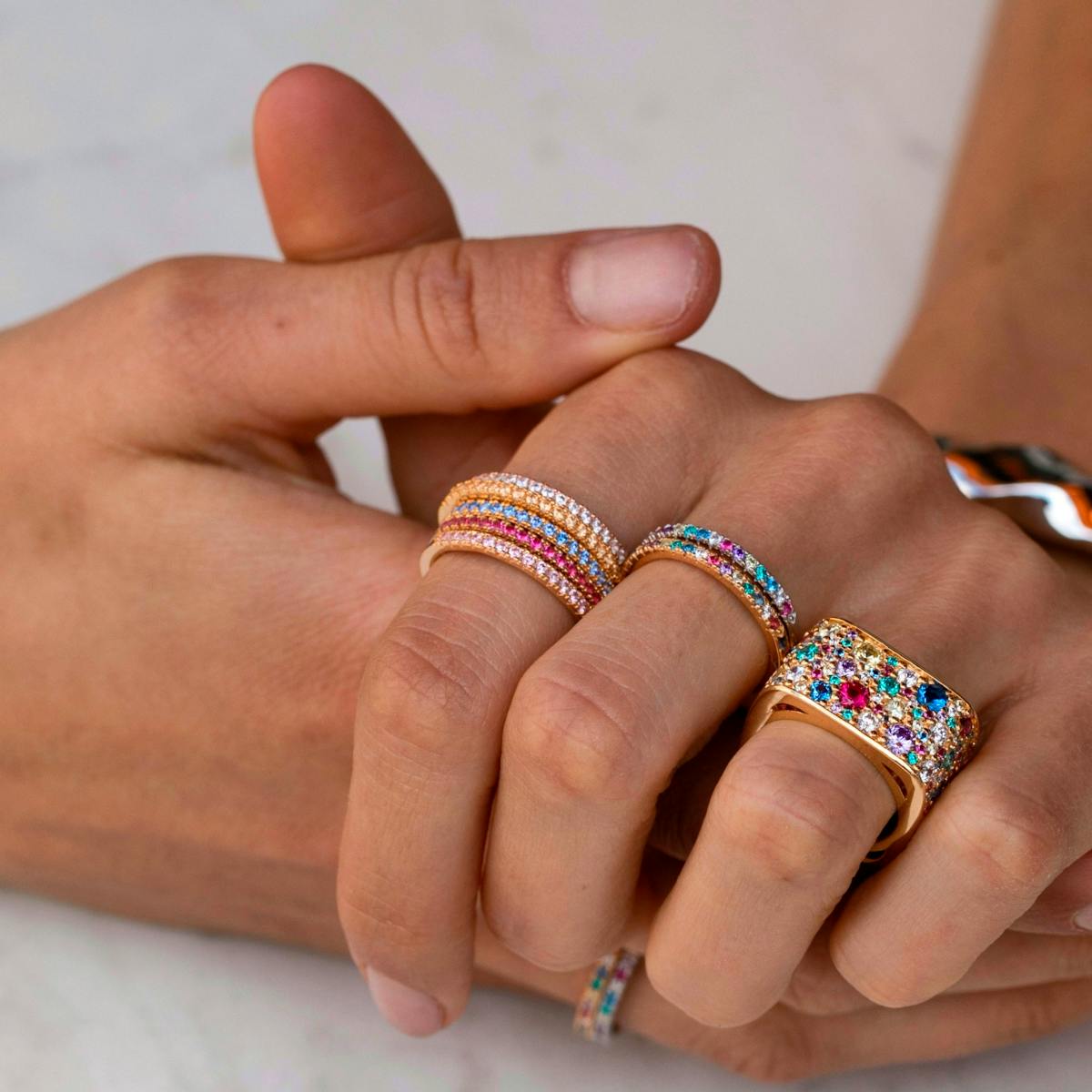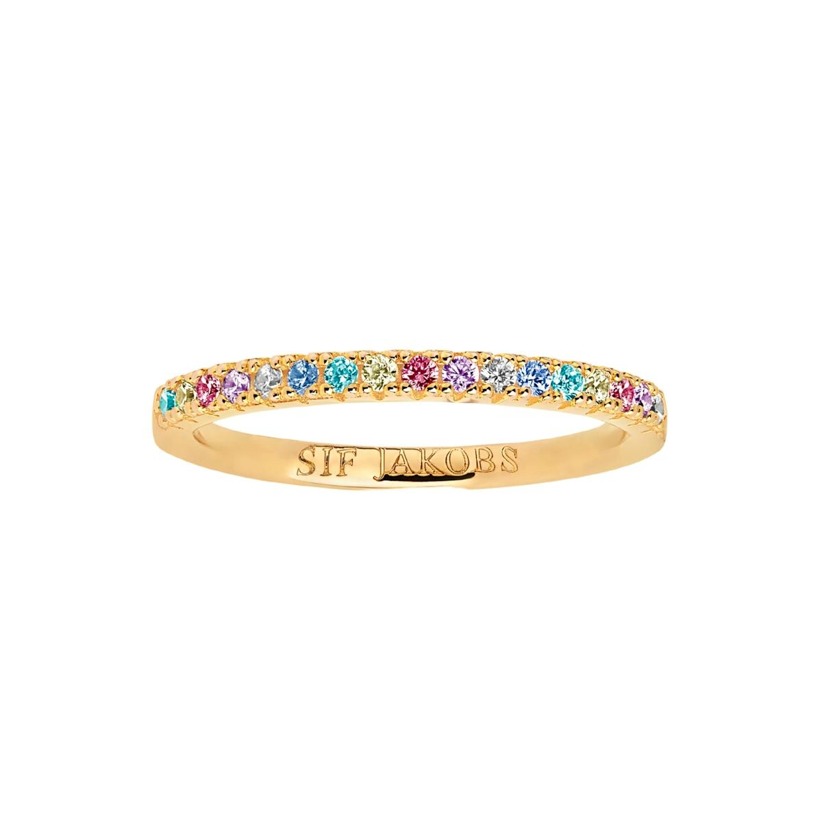 Ringen finns också med flerfärgade, rosa, gröna och blå zirkoner.