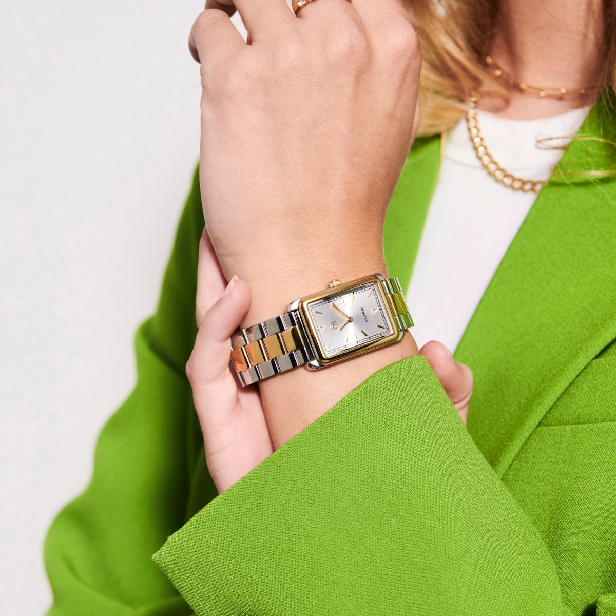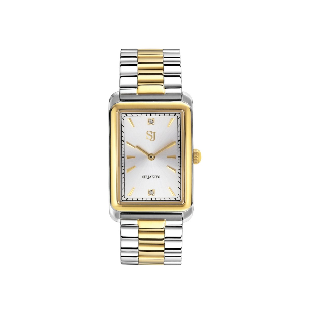 Dette ur fås også i en tofarvet version med forgyldt og sølv metallisk finish, hvilket giver et alsidigt look, der passer til enhver stil.