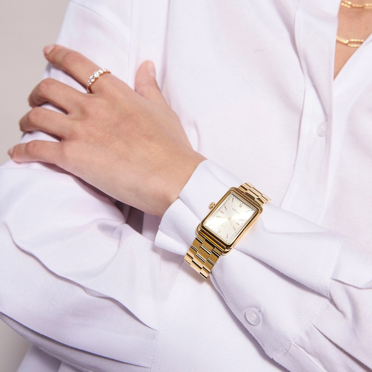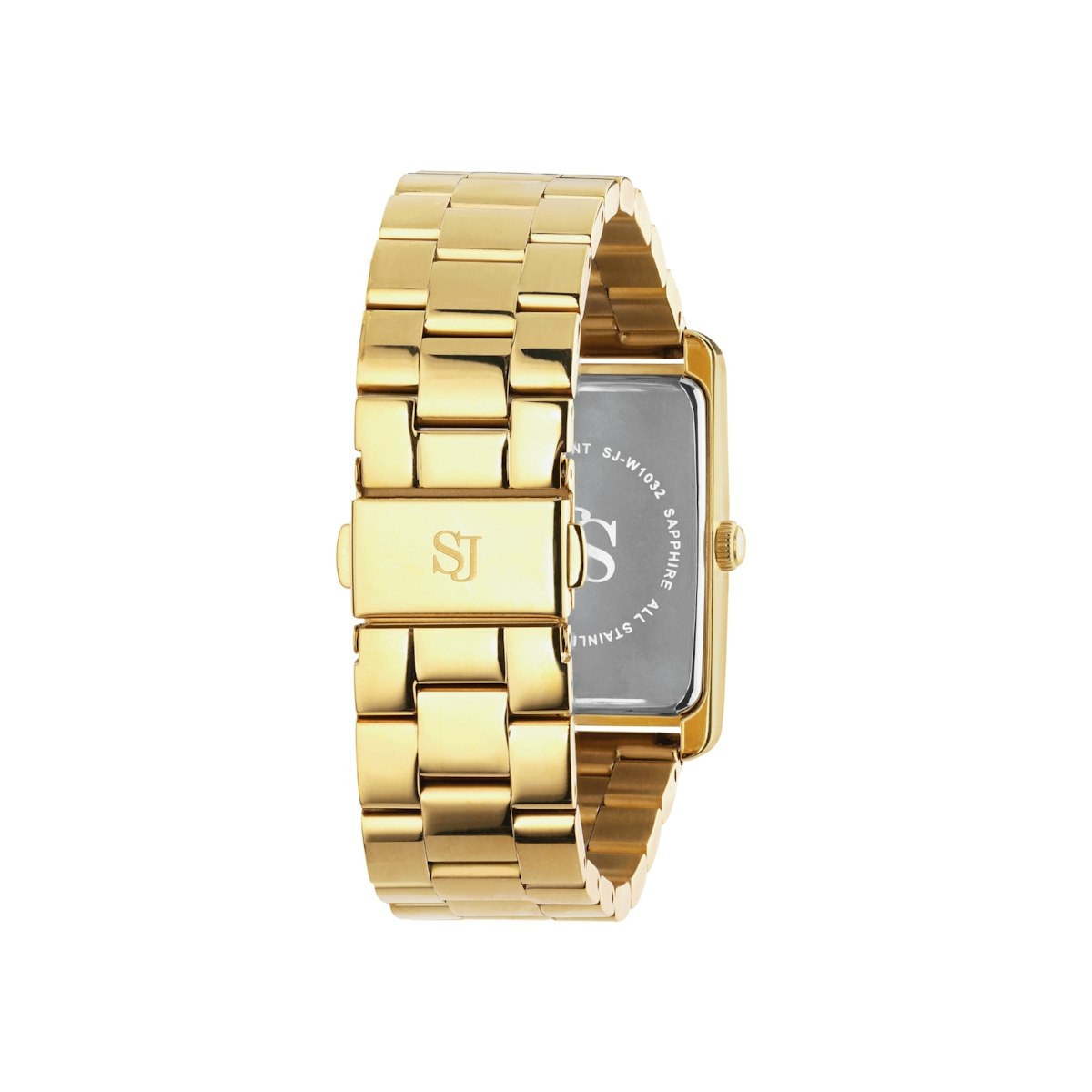 Dette elegante ur er udført i forgyldt rustfrit stål med en poleret overflade, der giver et moderne og luksuriøst udtryk. Uret er beskyttet med safirglas, og den smukke guld metalliske urskive prydes af funklende hvide zirconia, som tilføjer en ekstra dimension af elegance. Med en vandtæthed på op til 30 meter og et præcist Miyota-urværk, er dette ur både funktionelt og stilfuldt, ideelt til både hverdag og særlige anledninger.
