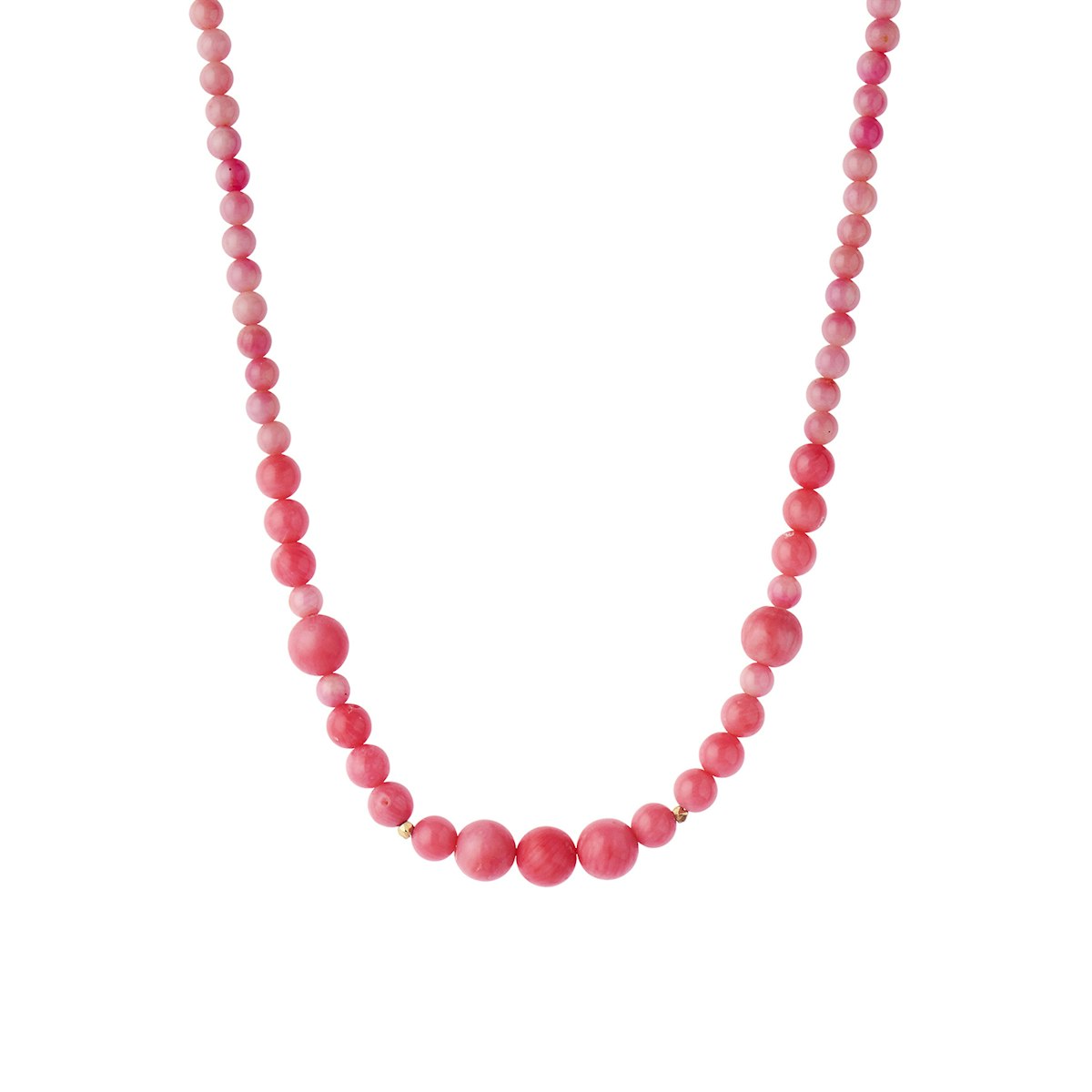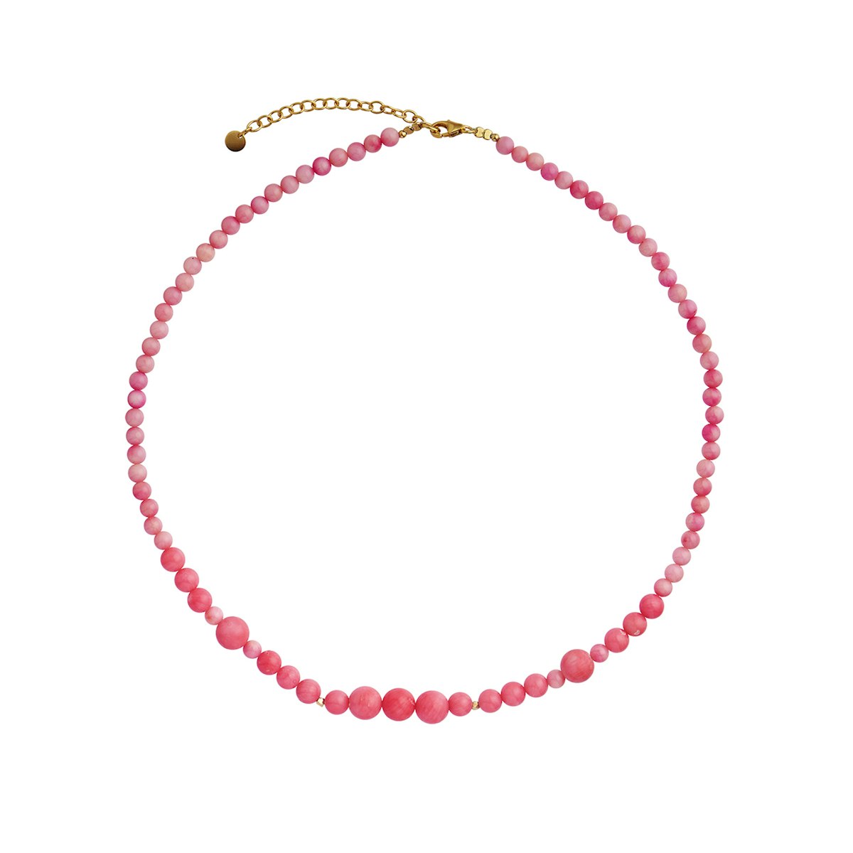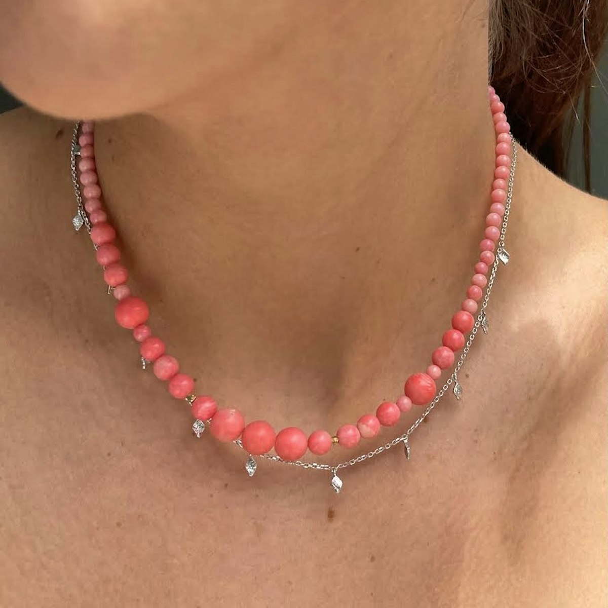 En dejlig halskæde med koralkrystaller, der tilføjer et strejf af sommer og coolness. Hver koralkrystal er unik, og der kan forekomme små uregelmæssigheder og naturlige skønhedspletter, da krystallen varierer afhængigt af, hvordan den er slebet under fremstillingen. Dette gør hver krystal og halskæde helt unikke, så ingen to er ens.