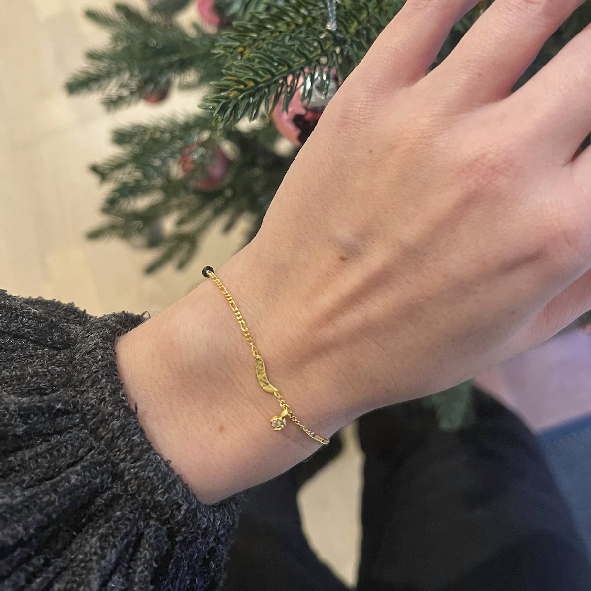 Et elegant og stilfuldt kædearmbånd med fine, rå detaljer i vedhæng og ædelsten.